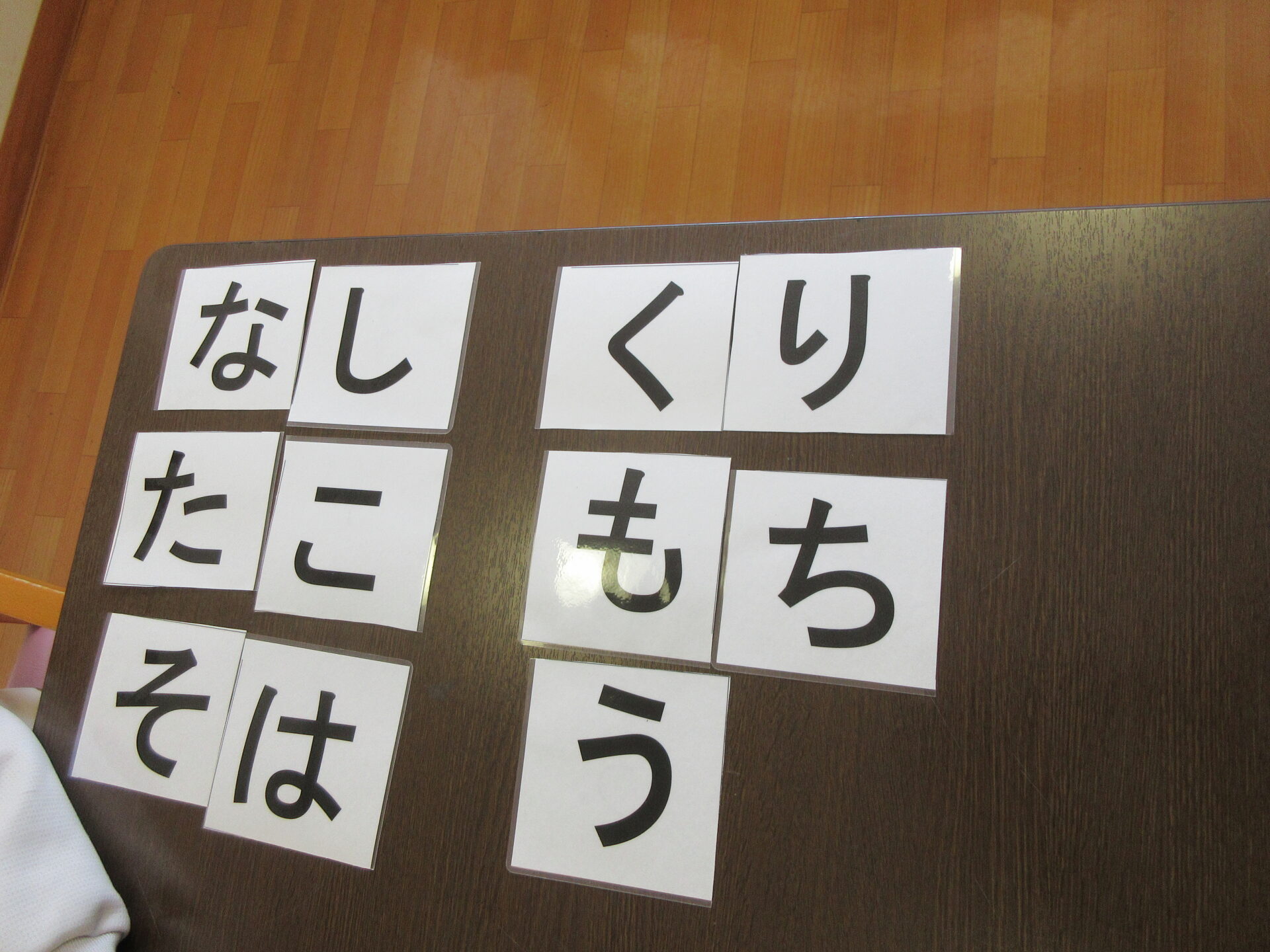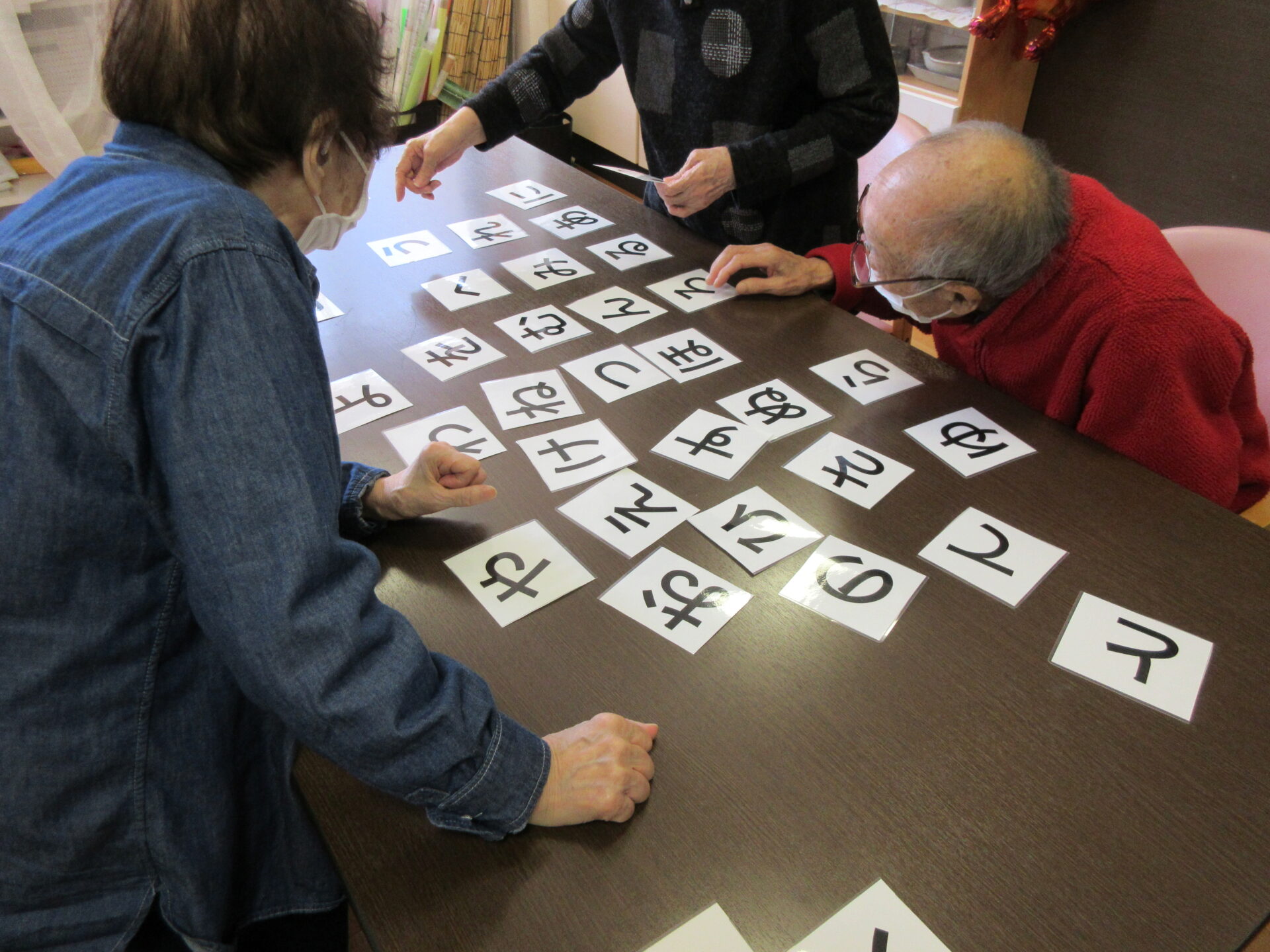 みんなで、脳トレ。50音のカードを組み合わせて、食べ物の名前を出来るだけ多く作ります。