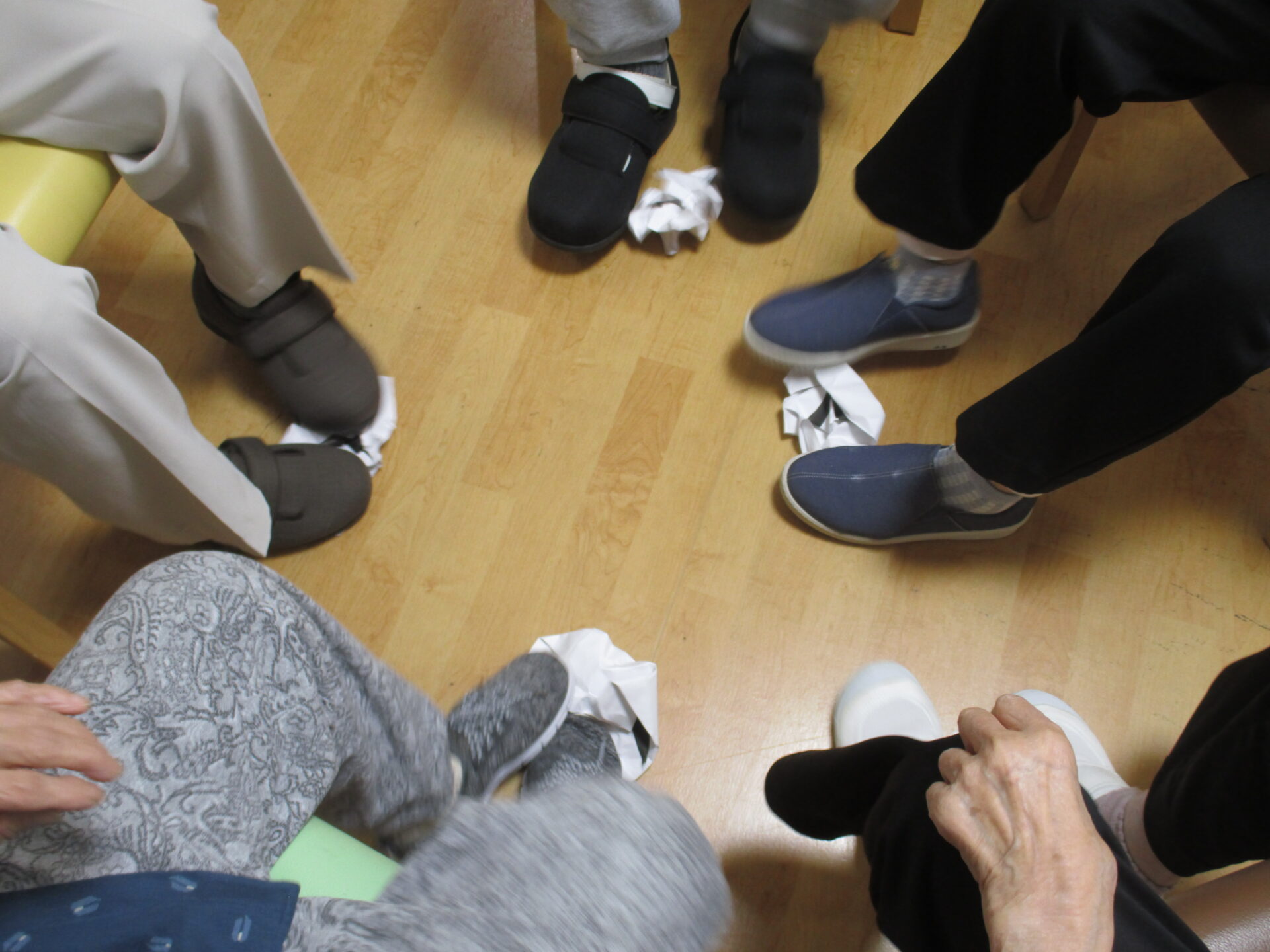 足を使って紙をひらき、書いてある5文字の言葉を当てる競技です!