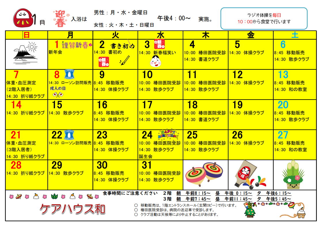 ケアハウス和 1月予定表を掲載します(‘◇’)ゞ