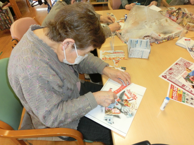 チラシをちぎって紙に貼り付けていきます。