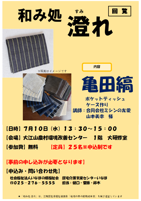 居宅・訪問 和み処 澄れの開催😁 2024-07-10 居宅・訪問 本部 和み処 澄れを開催しました! 本日は、亀田縞を使ったポケットティッシュケース作りを行いました! 多くの地域のみなさんにご参加いただきまして、ありがとうございました☆ 投稿ナビゲーション 前の記事次の記事