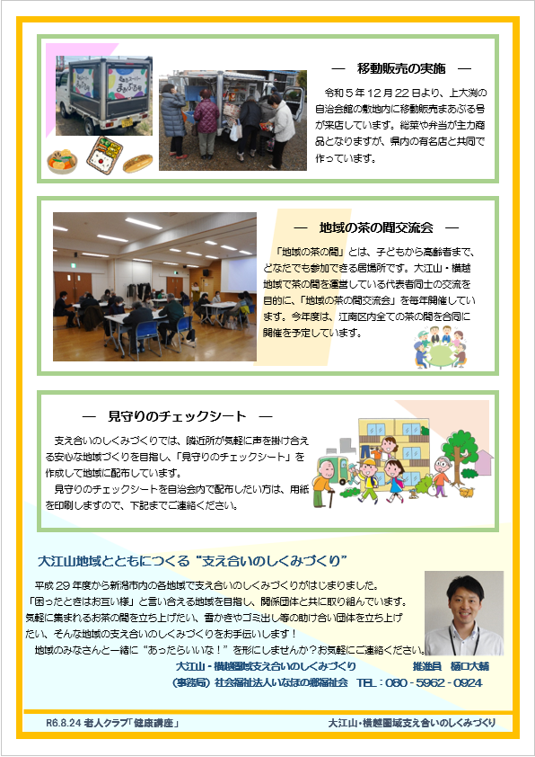 また、新潟市からの受託事業である「(新潟市生活支援体制整備事業)大江山・横越圏域支え合いのしくみづくり」の活動報告も行いました。