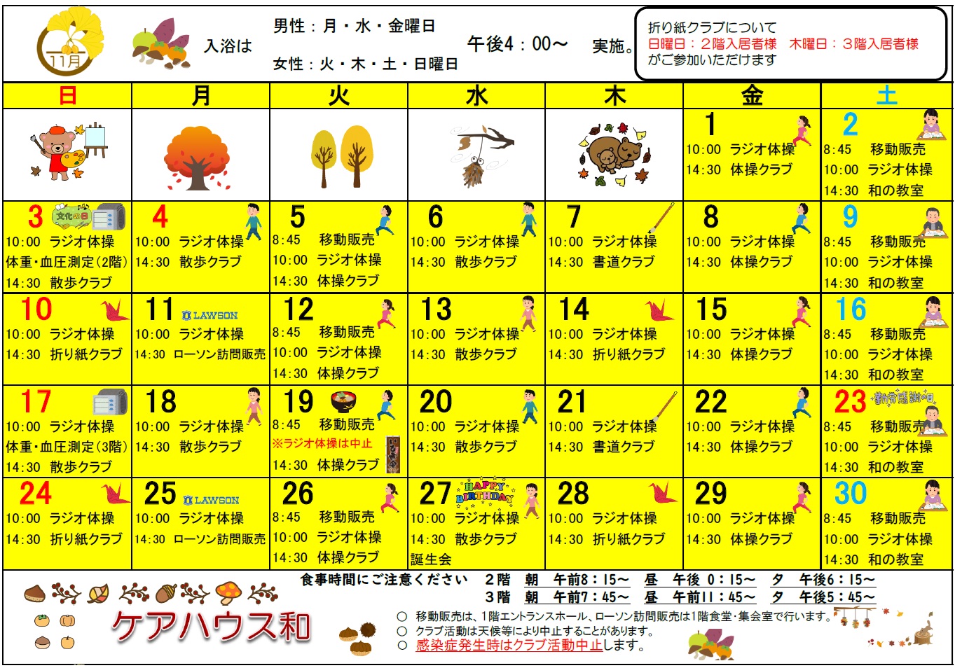 ケアハウス和 11月の予定表を掲載します(^^♪