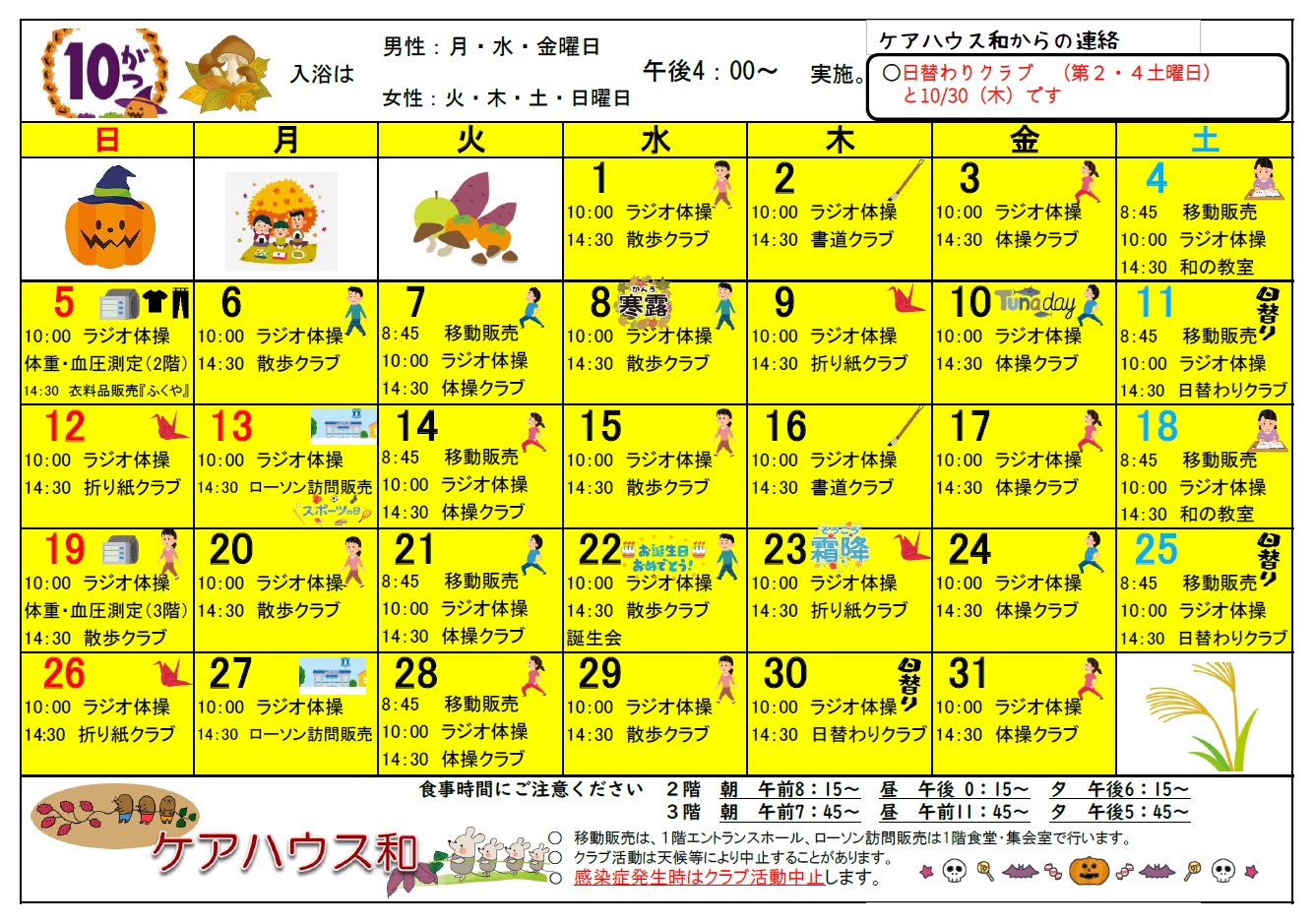 ケアハウス和 10月予定表を掲載します(・ω・)