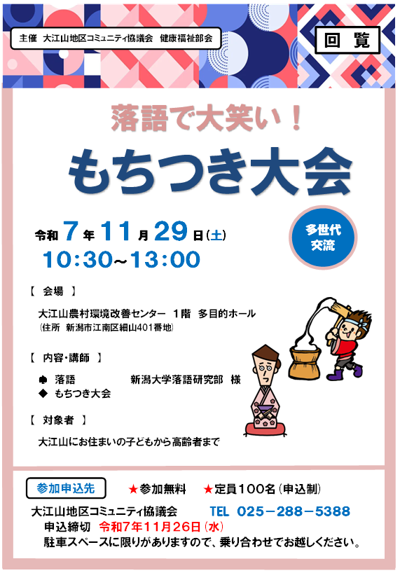 大江山農村環境改善センターにて、「落語で大笑い!もちつき大会」に参加しました。