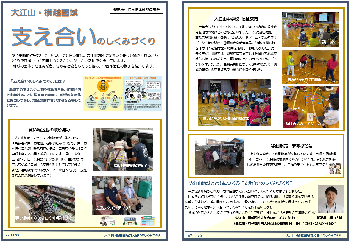 当日は、当法人が新潟市より受託している「大江山・横越圏域支え合いのしくみづくり」の資料を配布し、啓発活動も実施しました。